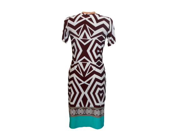 Bellissimo Vestitino a mezza manica Kristal del Gruppo Boglietti con una fantasia bianca e marrone che finisce con una striscia verde acqua.