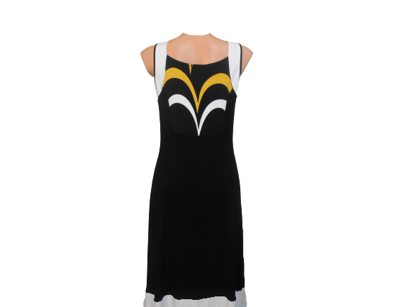 Vestitino Kristal del Gruppo Boglietti di colore nero con una fantasia sul davanti e sul dietro bianca e oro.